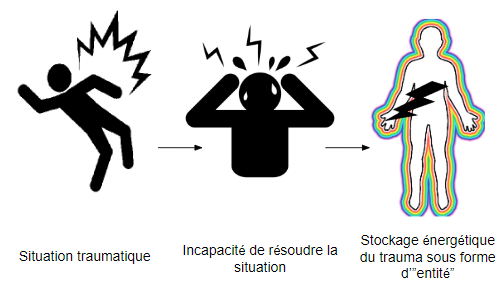 Les symptômes physiques n’apparaissent que lorsque, suite à une situation traumatique incomprise, une émotion drainante ou une pensée limitante né et prend la place d’un" bout" d'âme, qui se détache alors du corps. Ces émotions ou pensées limitantes qui prennent la place de l'âme dans le corps sont appelées "ENTITES".